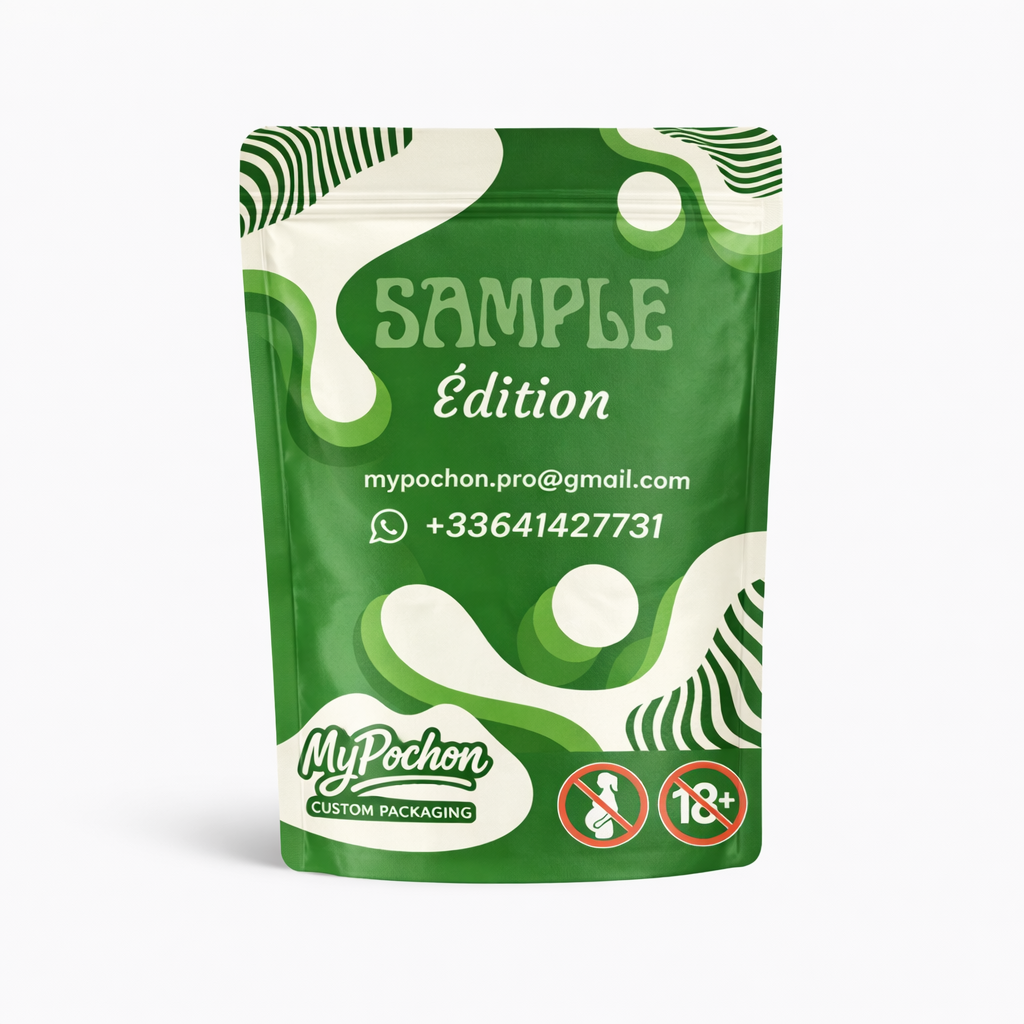 Custom doypack with zip closure, high-barrier aluminum packaging, fully customizable with logo, design, and colors.
